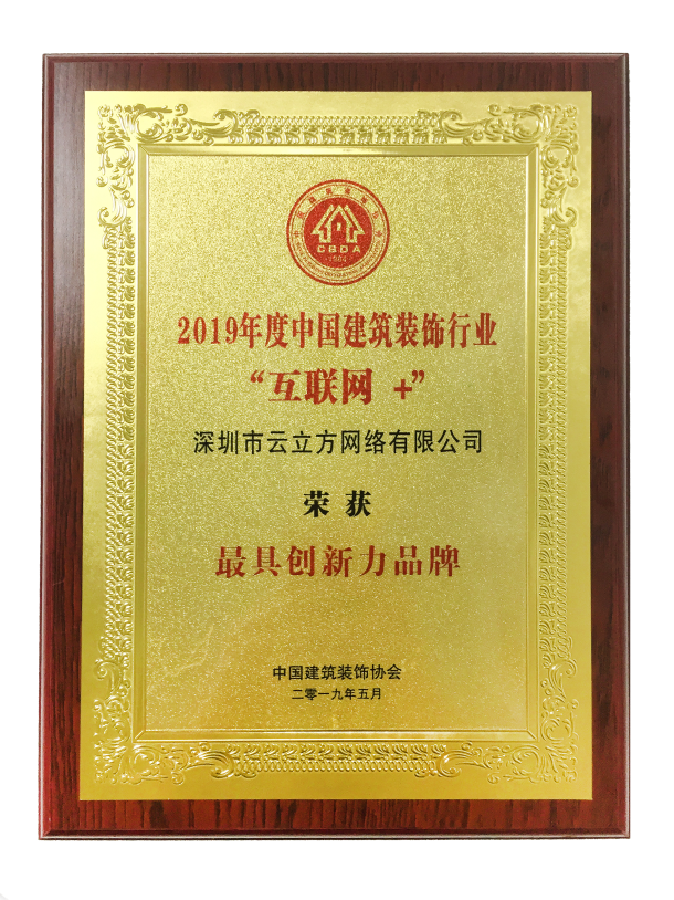 會上,云立方憑借過硬的品質榮獲2019年度中國建筑裝飾行業“互聯網+”最具創新力品牌。獲得這一殊榮,是業界對于我們云立方品牌的肯定。