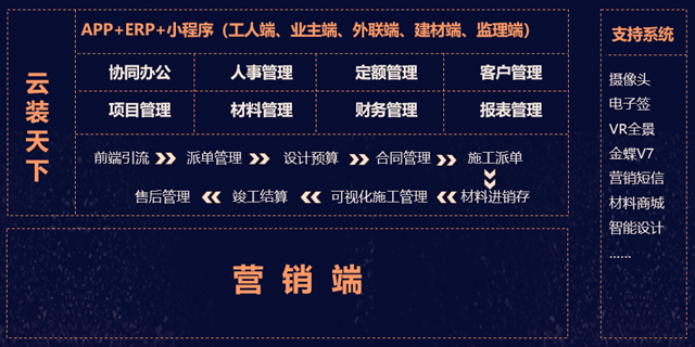 “云裝天下APP+ERP+小程序,賦能裝企打破部門間的信息孤島,形成管理上的閉環,做到簡化裝修流程、縮短產業鏈條、降低運營成本、提升整個裝修效率及品質。”