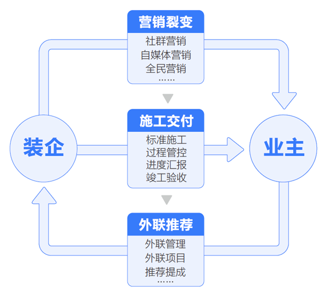 1、前期先梳理公司相關品牌,再通過移動互聯網宣傳推廣、上架官網、小程序,對私域流量進行破冰,形成自主營銷體系,打破互聯網獲客的壟斷,獲取裝修客戶線索,解決獲客難的問題。