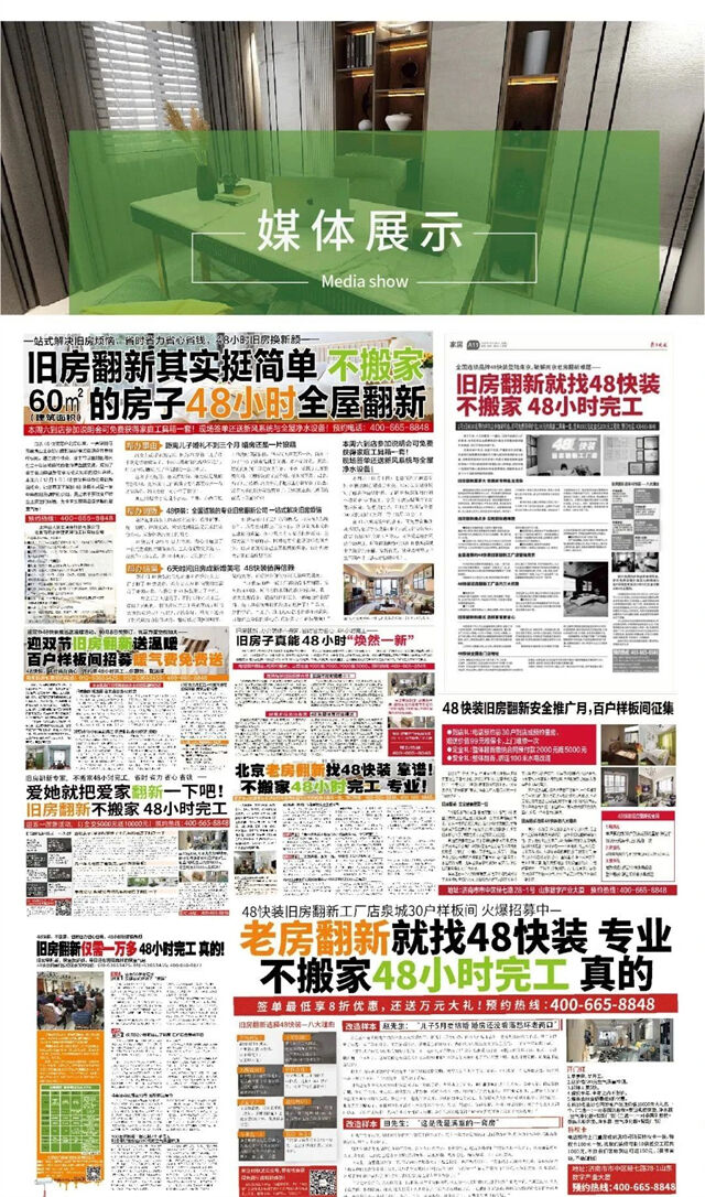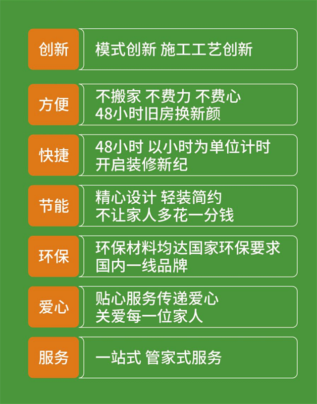 48快裝選擇舊房翻新這塊市場,提供有溫度的服務,承諾套餐內容保證48小時完工,質量不合格立即重裝,預算=決算,中途絕不加價,絕不多收客戶一分錢。