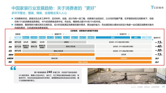 對消費者來說,家裝涉及眾多工序環節,且對材料、實施、設計均有一定門檻, 整裝新興模式在交房階段、設計階段就滿足消費者的基本需求,更加省時省力;