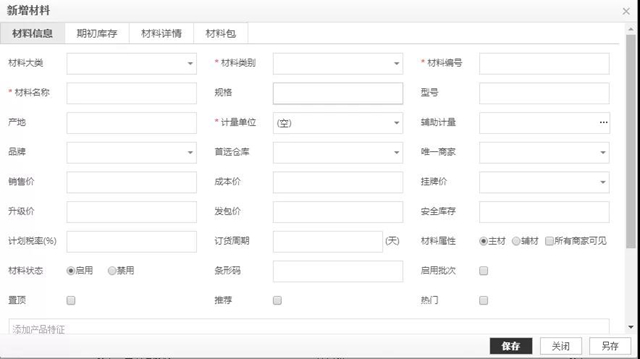 裝企在系統里的“材料寶典”錄入標準模式,包括材料大類、材料類別、材料編號、材料名稱等,材料員發起申購單時,可以直接選擇所需的材料,按需下定。如果遇到特別的材料,系統也支持自定義。