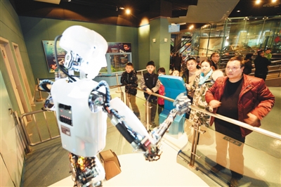 一月三十一日,寧夏科技館推出“聞雞起舞鬧新春”春節科普活動?!澳晁卓破铡薄叭斯ぶ悄堋钡榷囗椫黝}展覽吸引市民前來參觀。圖為觀眾在觀看機器人表演。