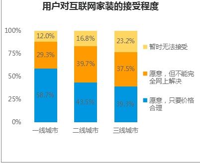 報告指出,用戶對于互聯網家裝的接受程度越來越高,根據2016年土巴兔官方網站調研可知,一線城市中近9成用戶接受互聯網家裝,6成用戶對互聯網家裝完全認可,在二三線城市中,互聯網用戶也在不斷提升,互聯網家裝接受度在80%左右。互聯網家裝已經贏得主流用戶群體的青睞。