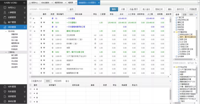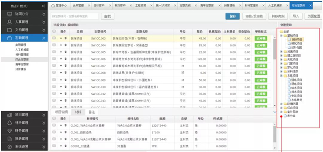 采取清單預算,根據定額的工料機構成,形成完整的項目材料需求表,通過生成申購單,將后續的采購和領料完全控制在計劃范圍內,并且事前掌控材料成本利潤,同理人工機械也在掌控范圍內;同時,直接生成施工進度計劃,多級分解任務,分配到人,區別單一項目經理制,使得公司一方面掌控好材料,一方面掌控好人員;兩手抓!默認就帶有中小裝企用得到的定額庫,無須花費大量時間整理公司的定額數據,還支持導入導出,快捷方便;公司統一口徑的定額庫,杜絕excel文檔難以實時同步容易給公司帶來的損失;