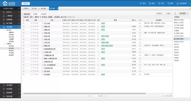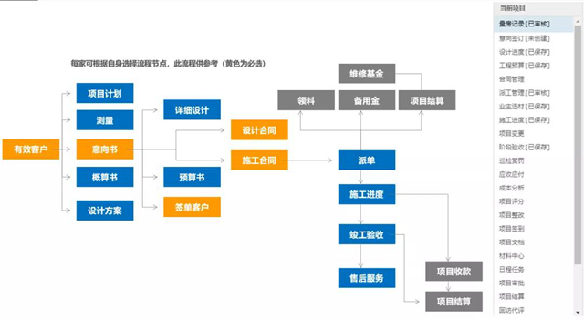 系統內置標準的項目管理流程,可選擇性使用,測量、意向書、概算、預算、設計方案、詳細設計、施工合同、派單、施工進度計劃、驗收、評分、收付款結算、備用金、材料款、維修基金等。