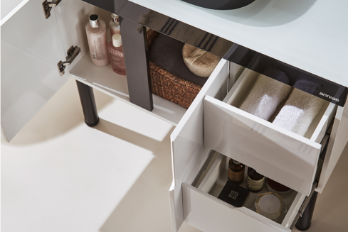 首先,選購金屬高腳款。利用高腳的設計,抬高柜底與地板的距離,直接化解了一般木制浴室柜容易受潮的問題。此外實金屬柜腳的“骨骼”堅實,輕松應付面盆和柜體的“壓力”,其防腐、防潮的特性確保柜腳接觸水后不變形,而表面經過涂層處理的柜腳,更是免除了水漬的侵擾。這樣子再也不怕潮氣入體,從而導致浴室柜走樣。
